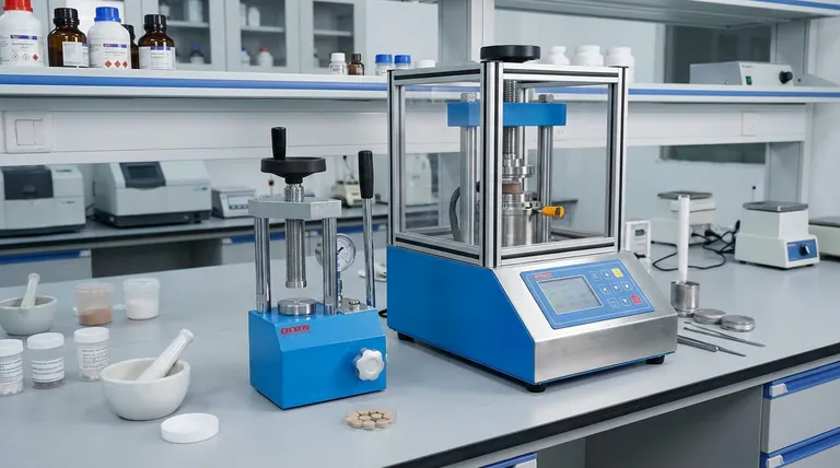 Em sua essência, as prensas de pastilha de XRF manuais e automáticas distinguem-se pelo seu método de aplicação de força. Uma prensa manual depende inteiramente de um operador para gerar e controlar fisicamente a pressão através de uma alavanca manual, enquanto uma prensa automática usa um motor elétrico e controles programáveis para fornecer pressão precisa e repetível com mínima intervenção do usuário.